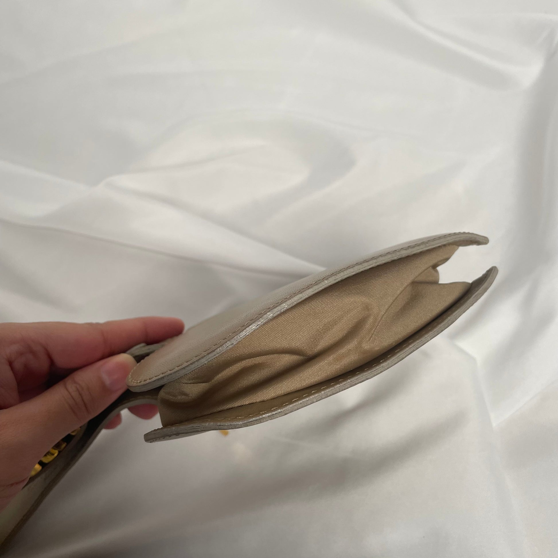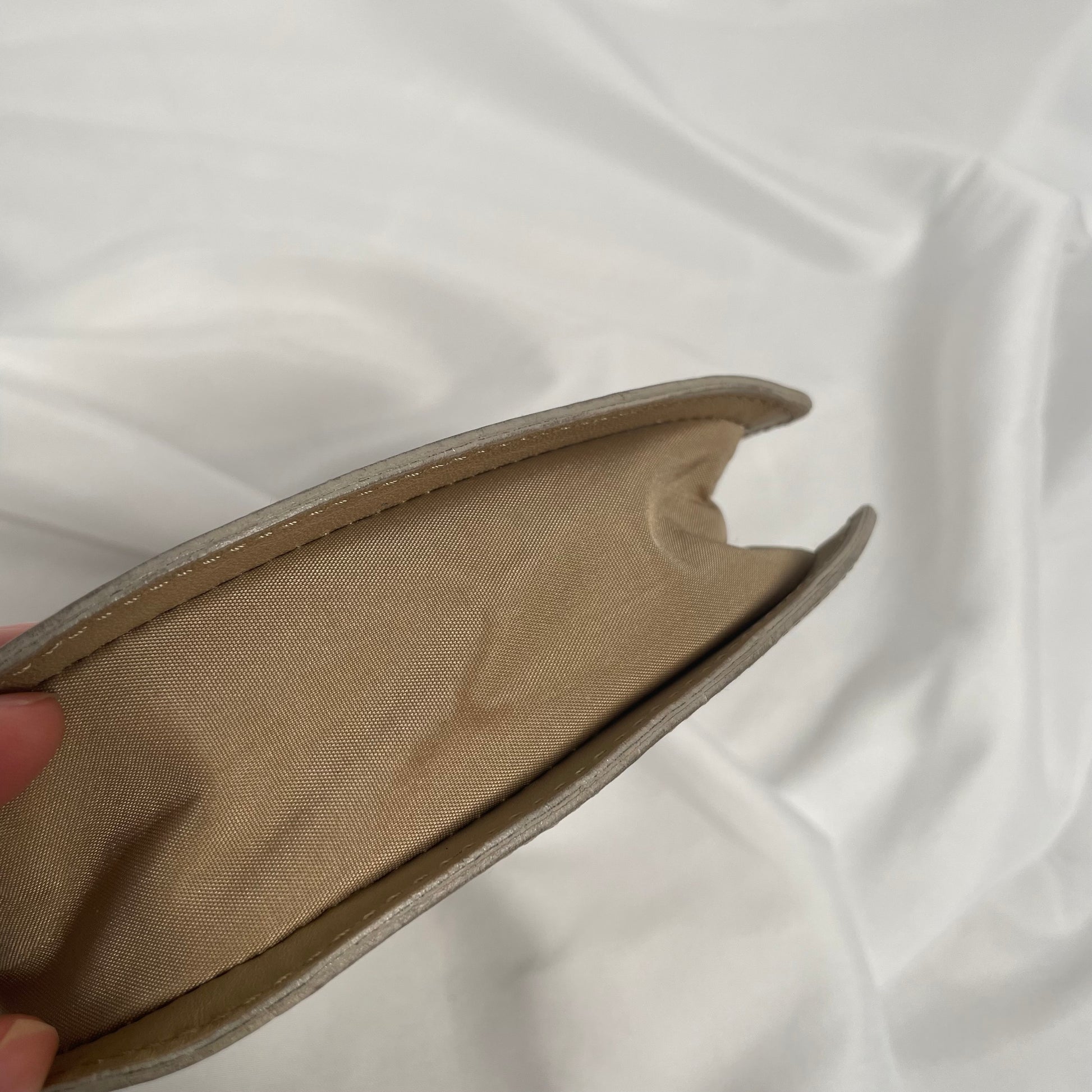 Condition: Good used condition. Leather has mild discolouration on the surface area of both sides, highlighted in photos. Hardware has signs of general wear. Stain on the fabric component of the bag, un-noticeable upon wear.