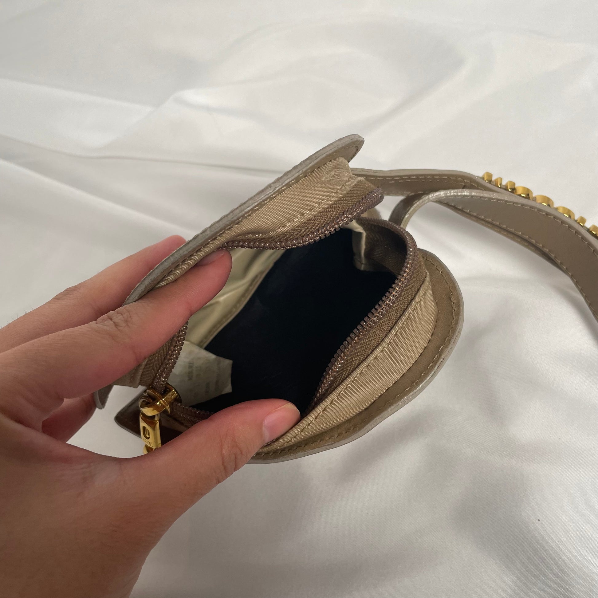 This is a Moschino heart shaped bracelet bag, manufactured and sold circa 1994. With the Moschino name adorned in gold coloured metal on the strap. "M" shaped zip for "Moschino".