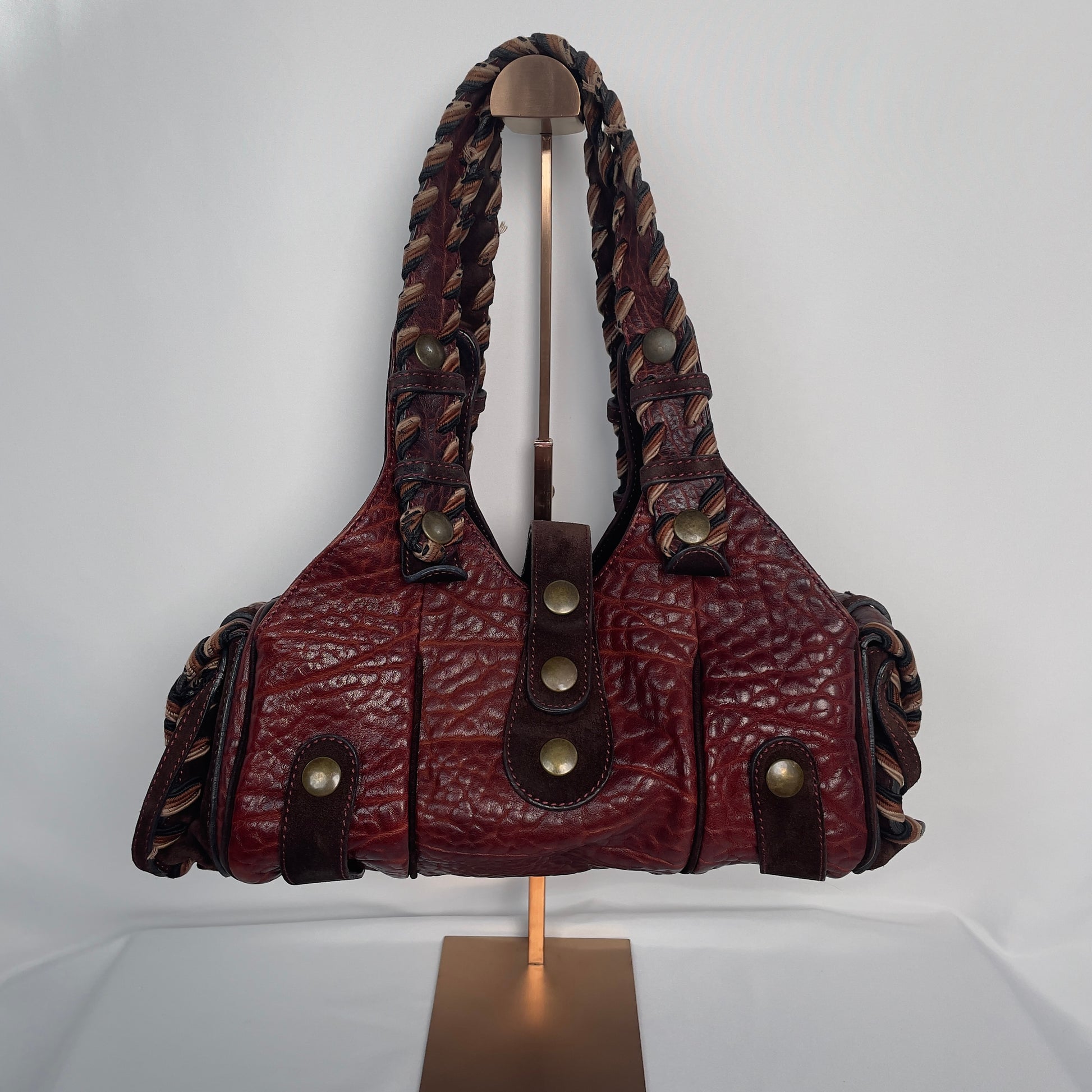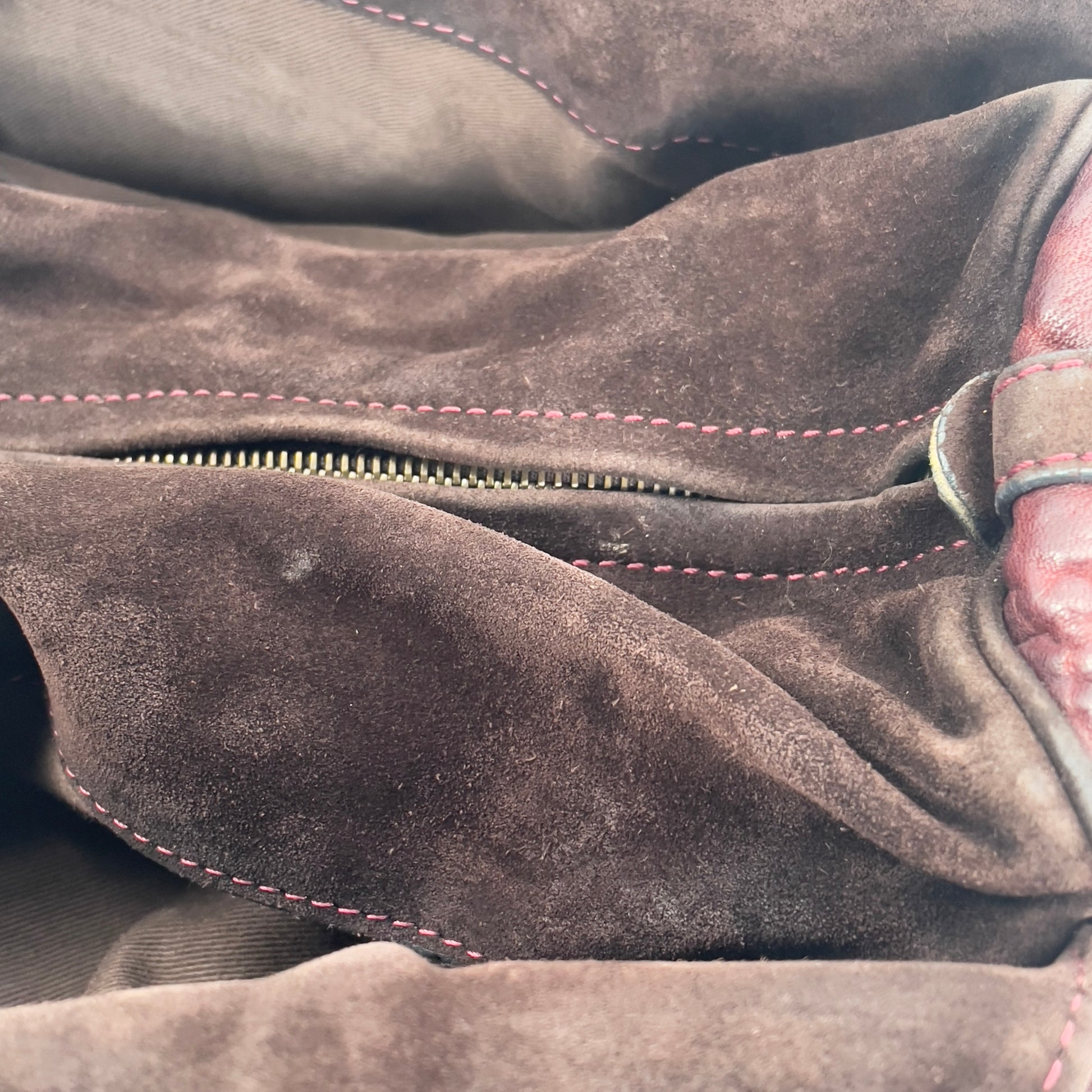 Condition: Good used condition. The leather body is in excellent condition. The straps has fabric entwined on the sides of the straps which show wear. The entire bag has been cleaned including the suede. Some small stains could not be removed, some balding spots.