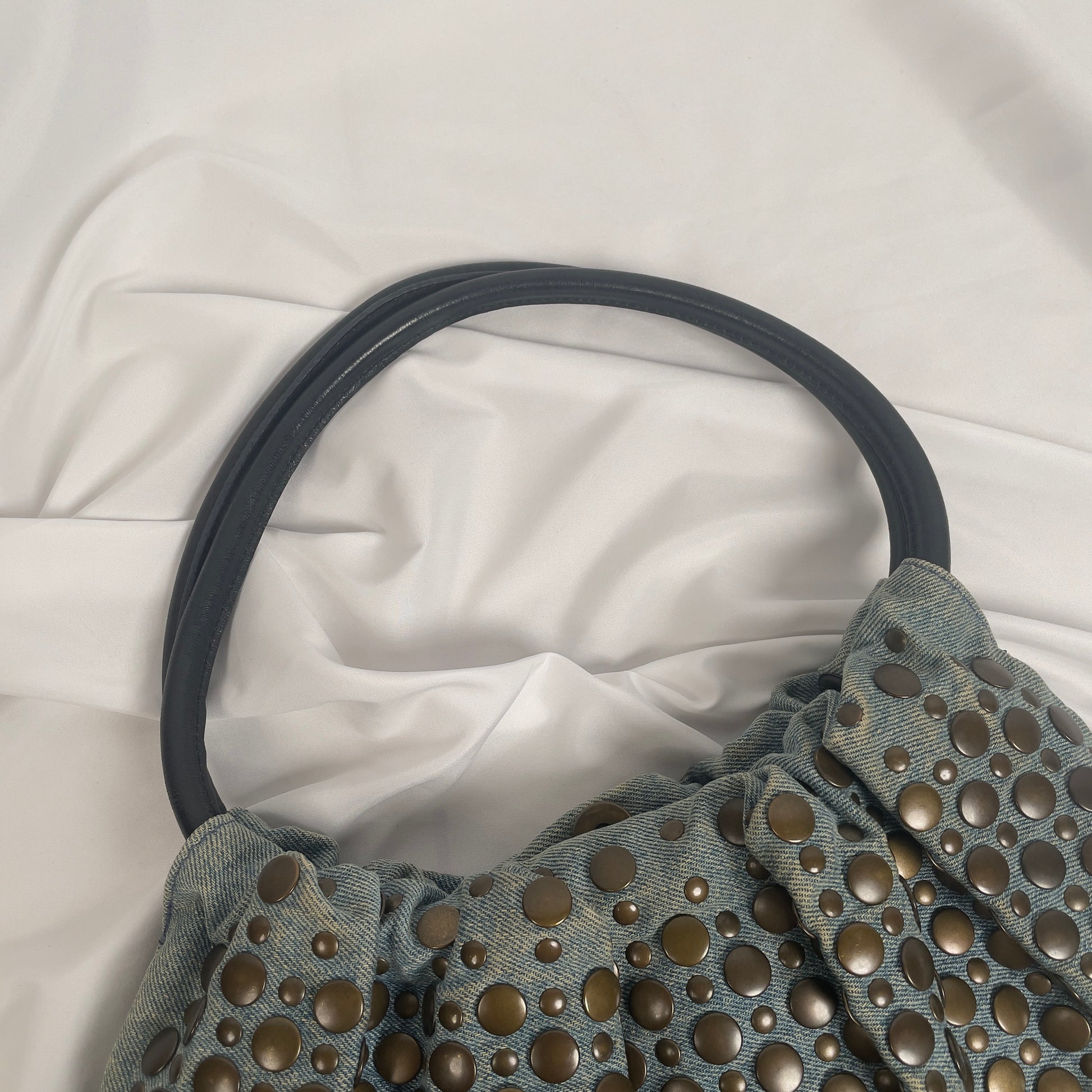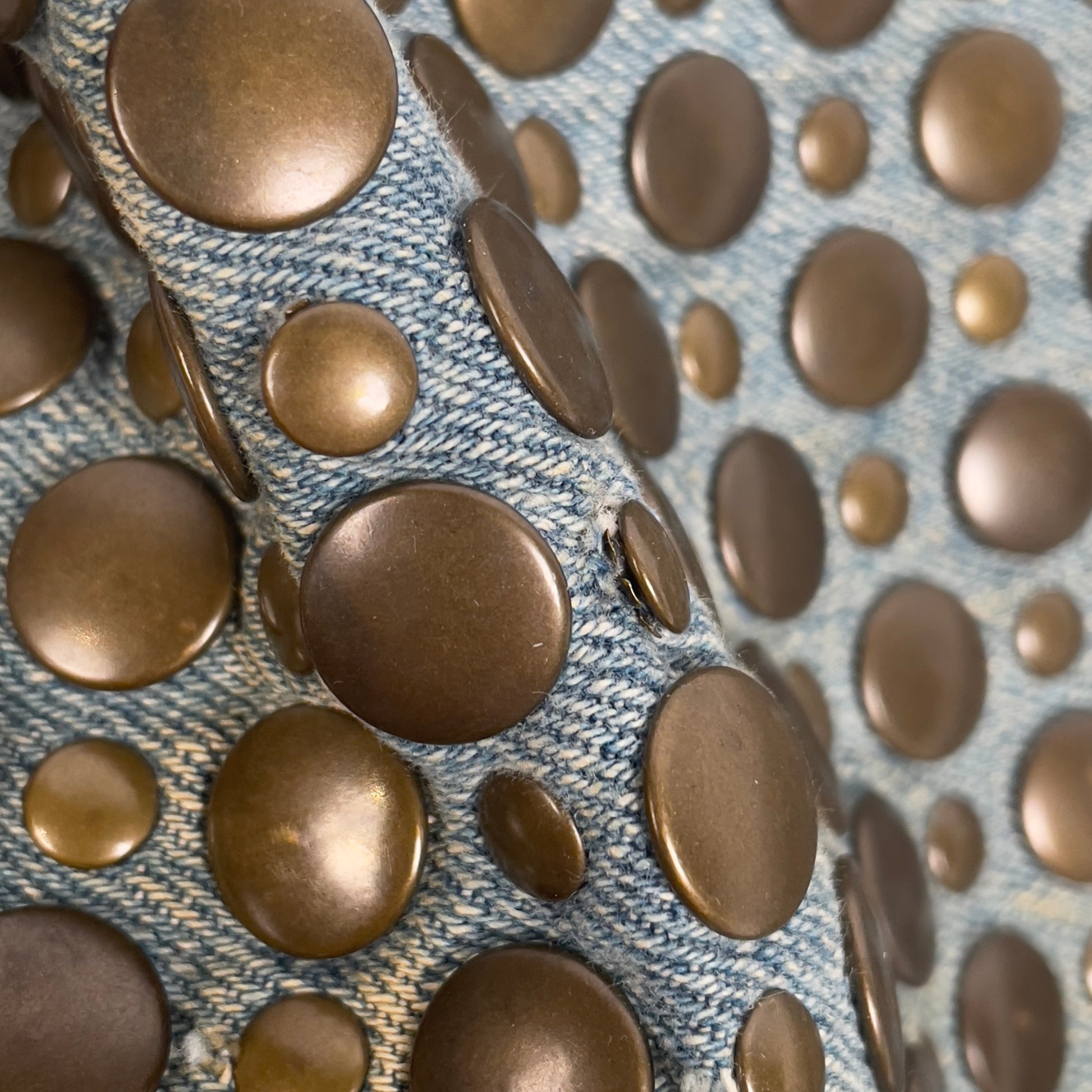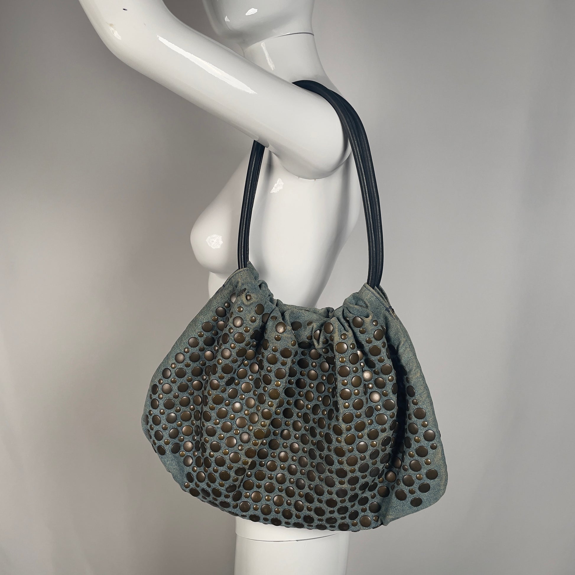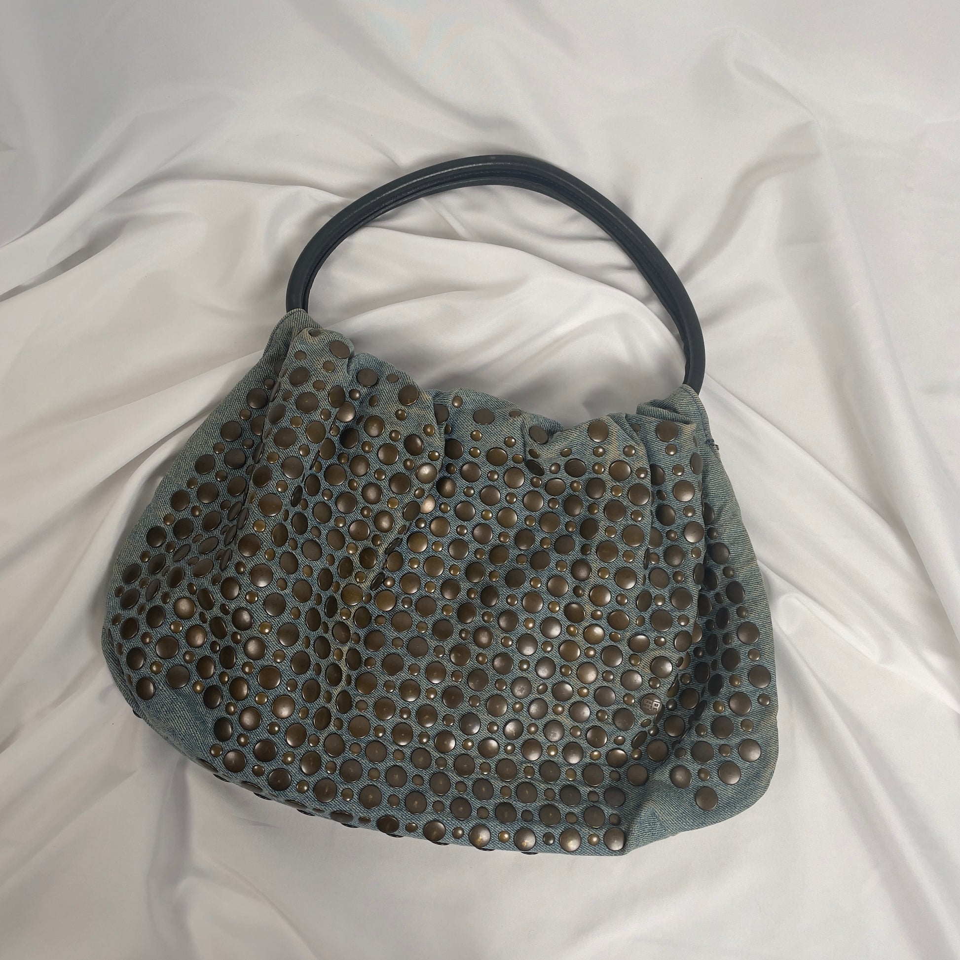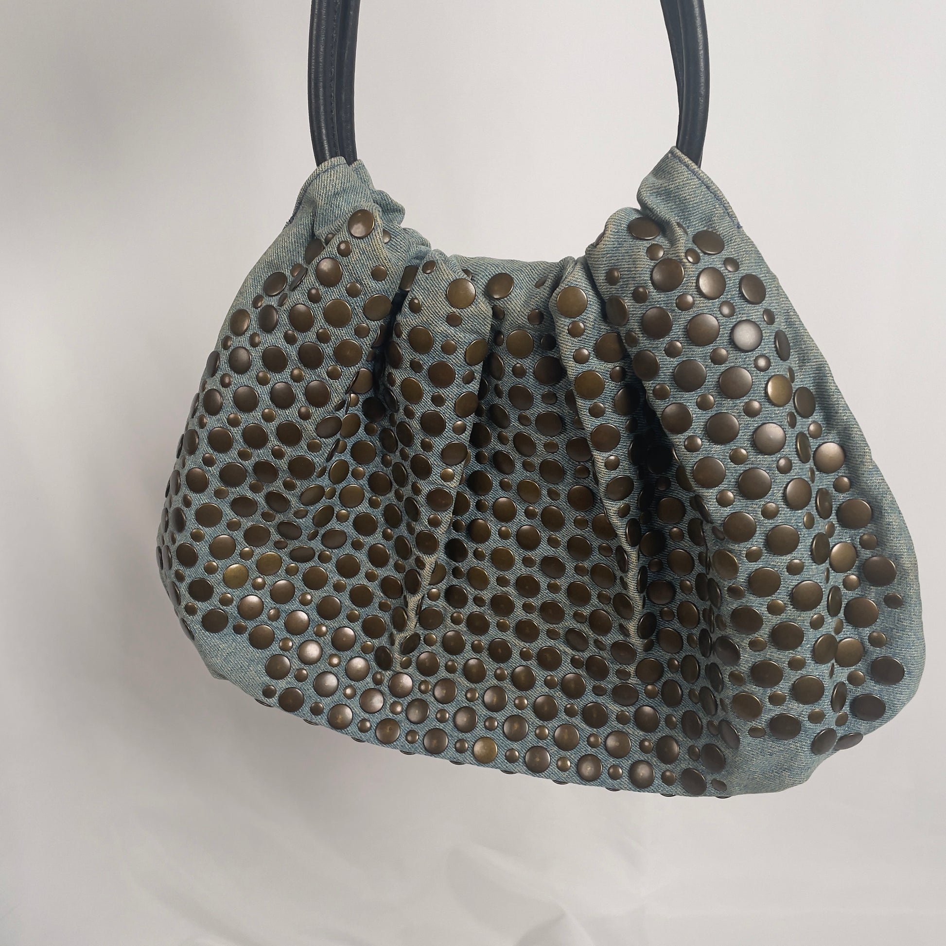 Condition: Good used condition, the leather straps has surface level discolouration, two studs have a lifted corner that is highlighted in a photo, this may be fixed by a professional or glued, they are not coming off. Inner lining is clean. Small cotton thread is present at the bottom. Denim has a distressed colouring (Unsure if this is intentional or from age)
