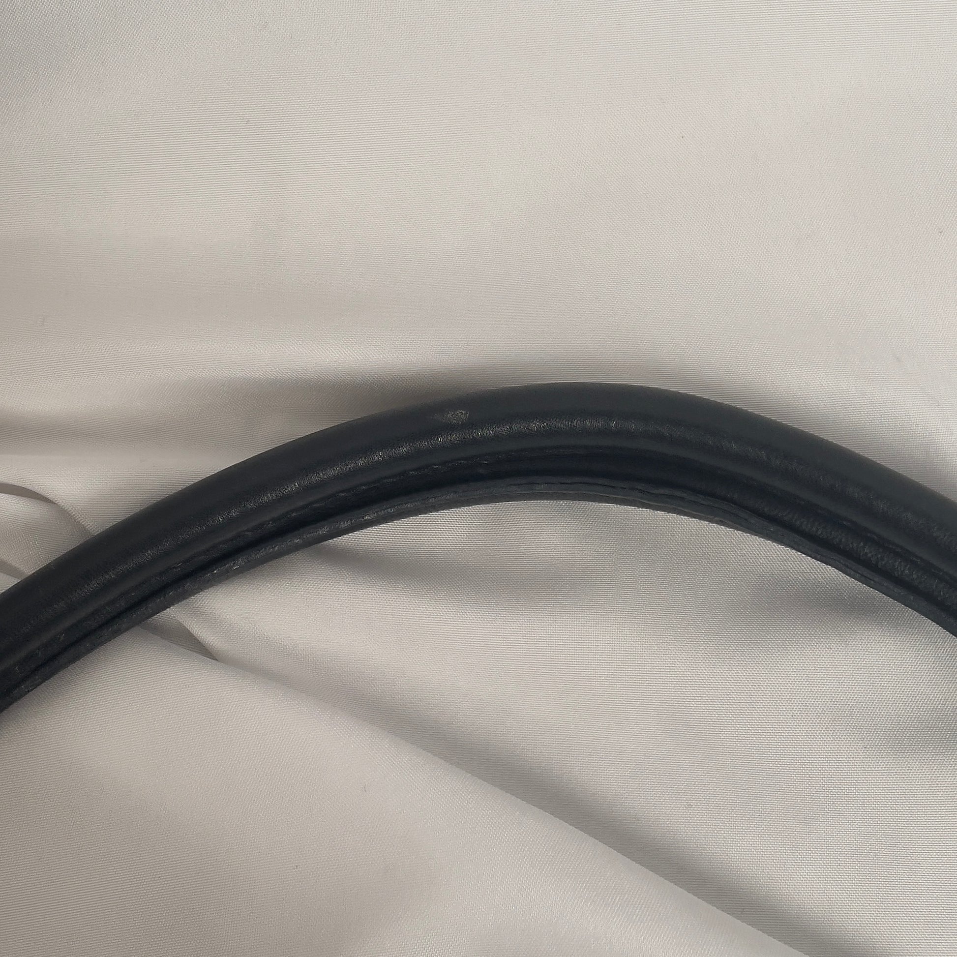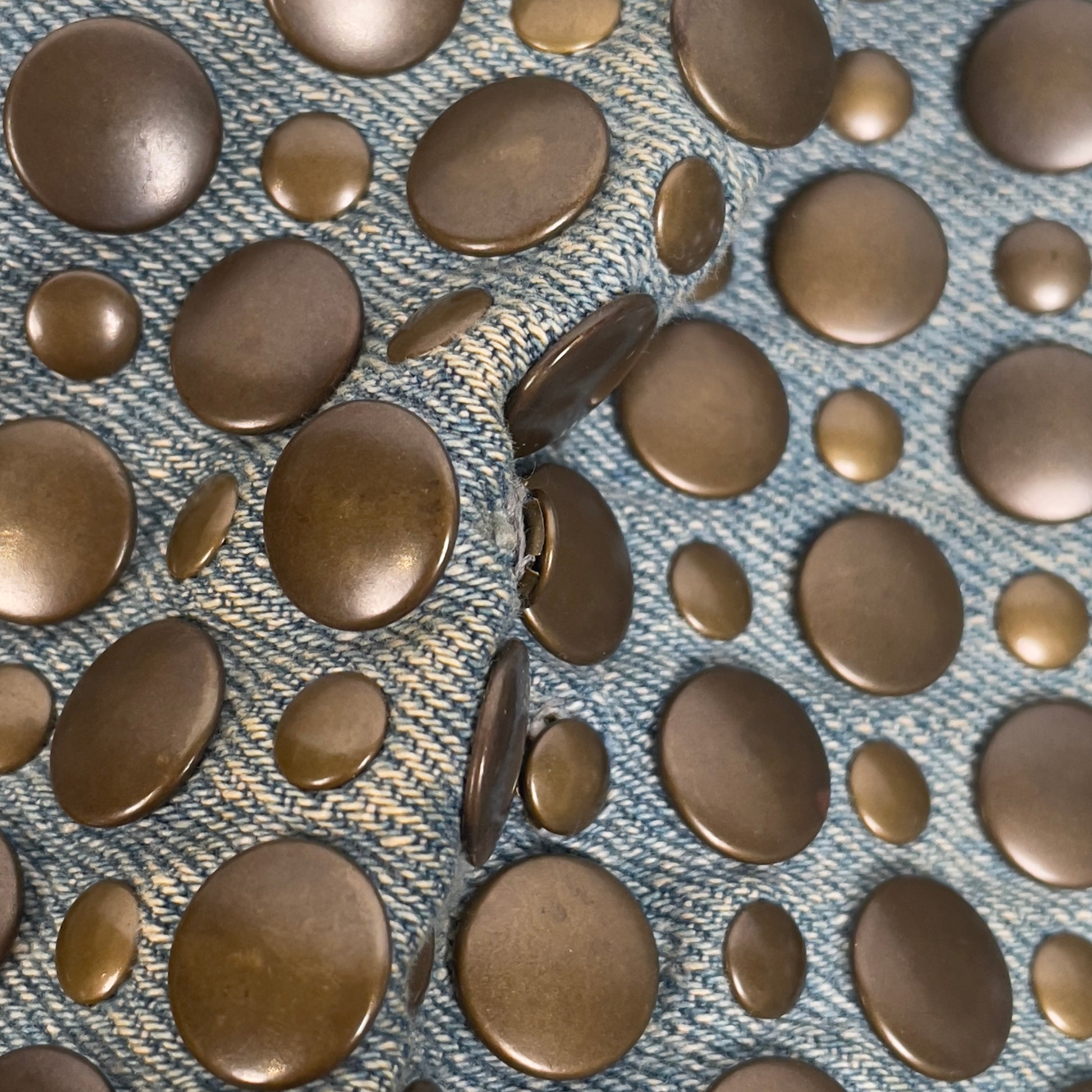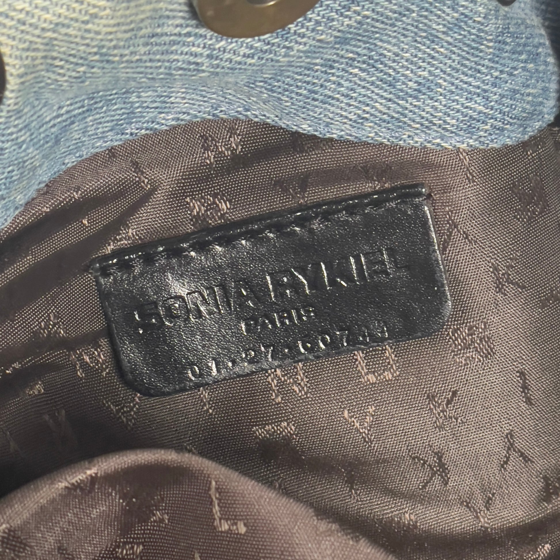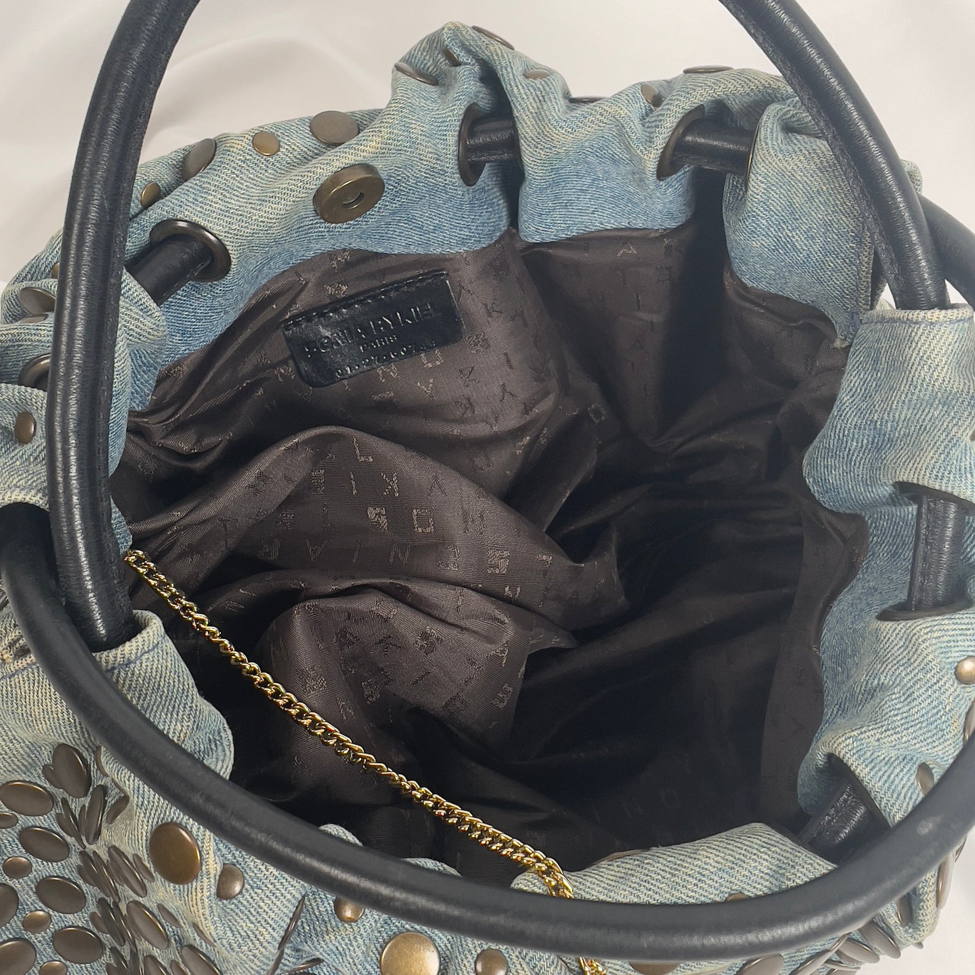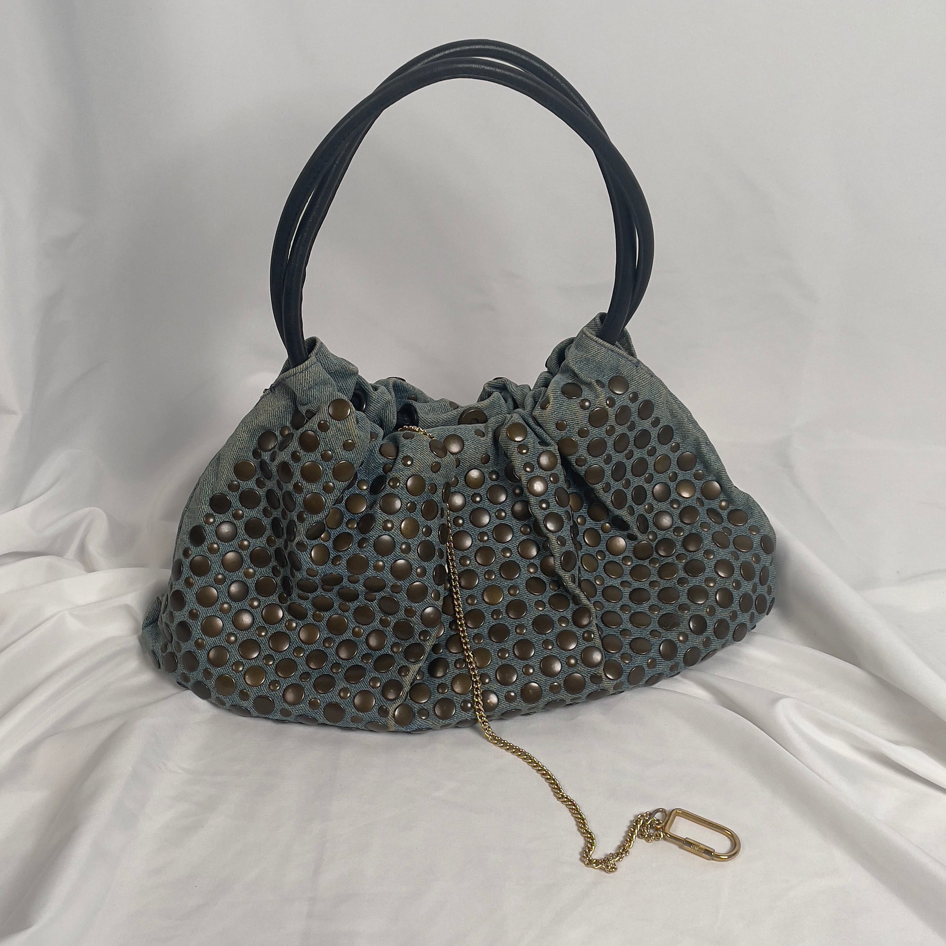 Condition: Good used condition, the leather straps has surface level discolouration, two studs have a lifted corner that is highlighted in a photo, this may be fixed by a professional or glued, they are not coming off. Inner lining is clean. Small cotton thread is present at the bottom. Denim has a distressed colouring (Unsure if this is intentional or from age)